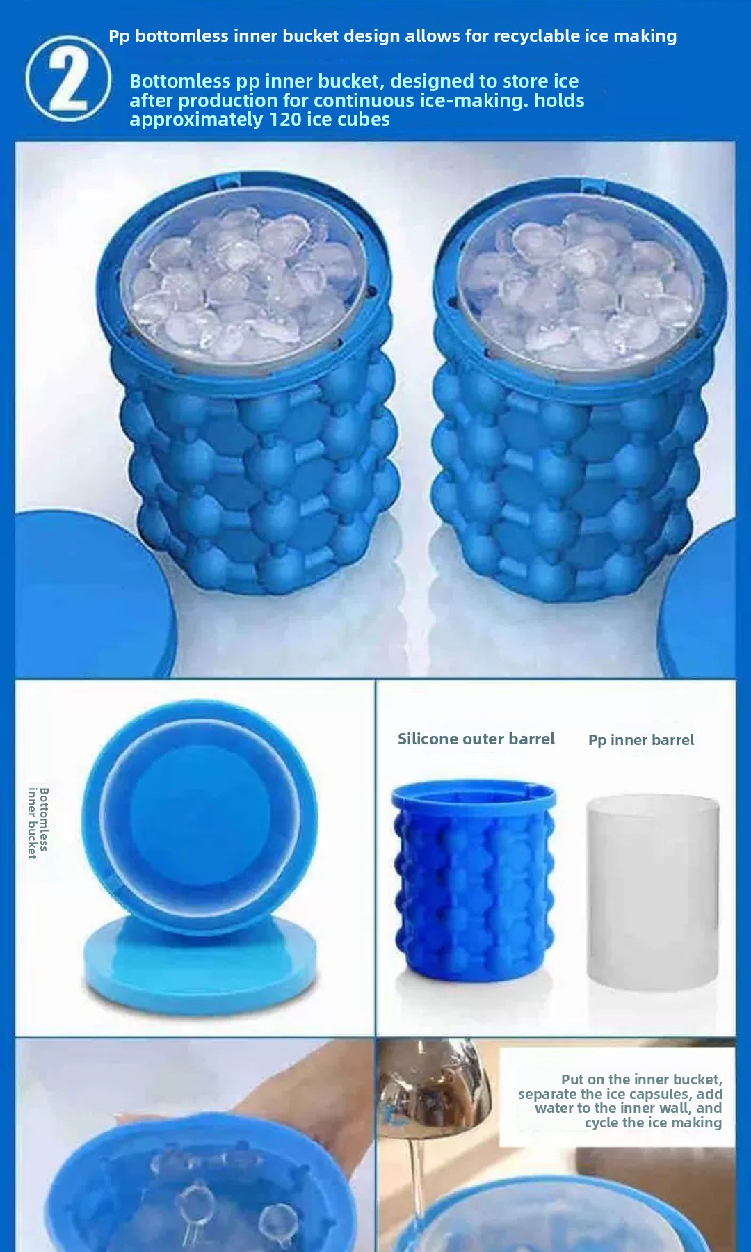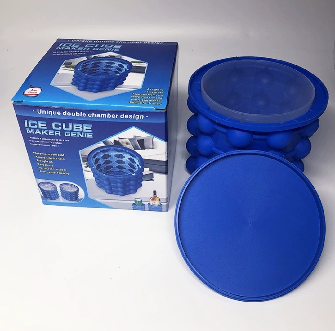Ice Cube Maker Genie with unique double-chamber design. Easily creates and stores ice cubes while keeping them cold longer. Simply fill, freeze, and twist to release ice. Great for home bars, parties, or everyday use.